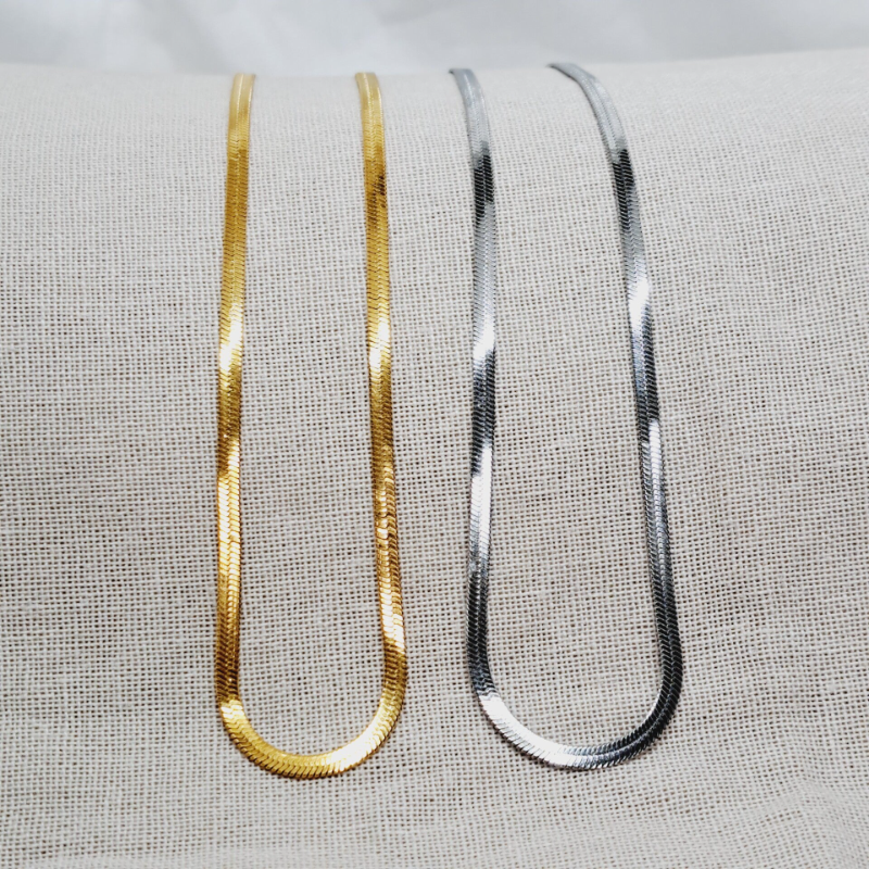 Een Stainless Steel ketting met een plat slangenpatroon en een breedte van 3mm of 4mm en ongeveer 44cm lang met een verlengketting in goud of zilver.