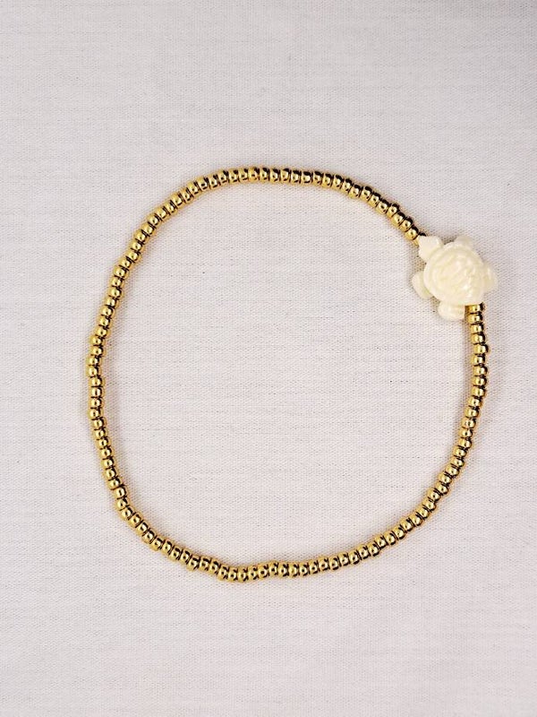 Elastisch armbandje van Miyuki kraaltjes gecombineerd met een ivoorkleurig schildpadje. Verkrijgbaar in goud of zilver.