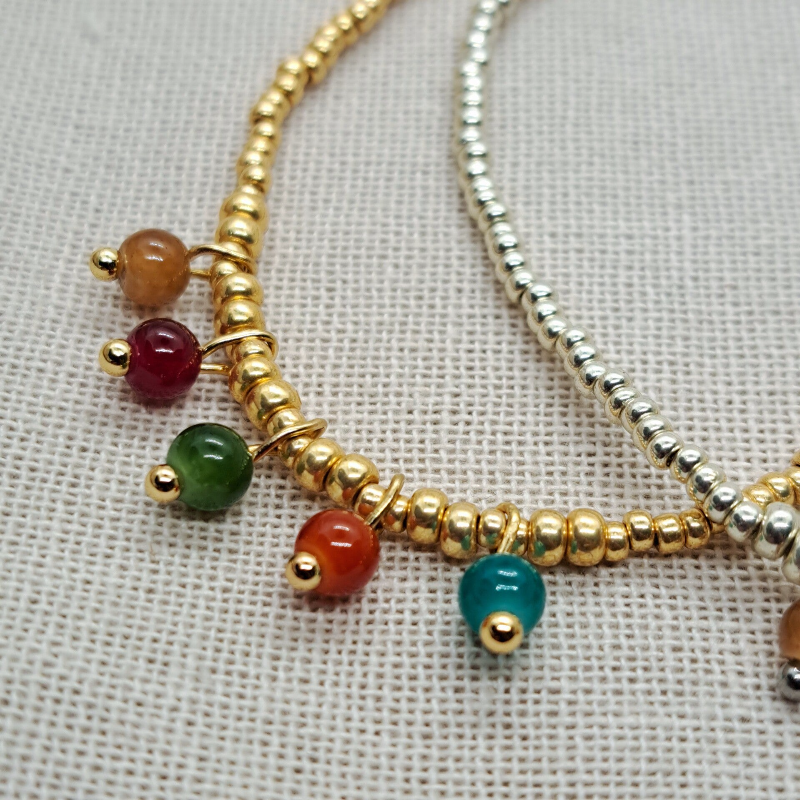 Elastisch armbandje van vergulde Miyuki kralen, met bedeltjes in warme kleurtjes. Verkrijgbaar in goud of zilver.