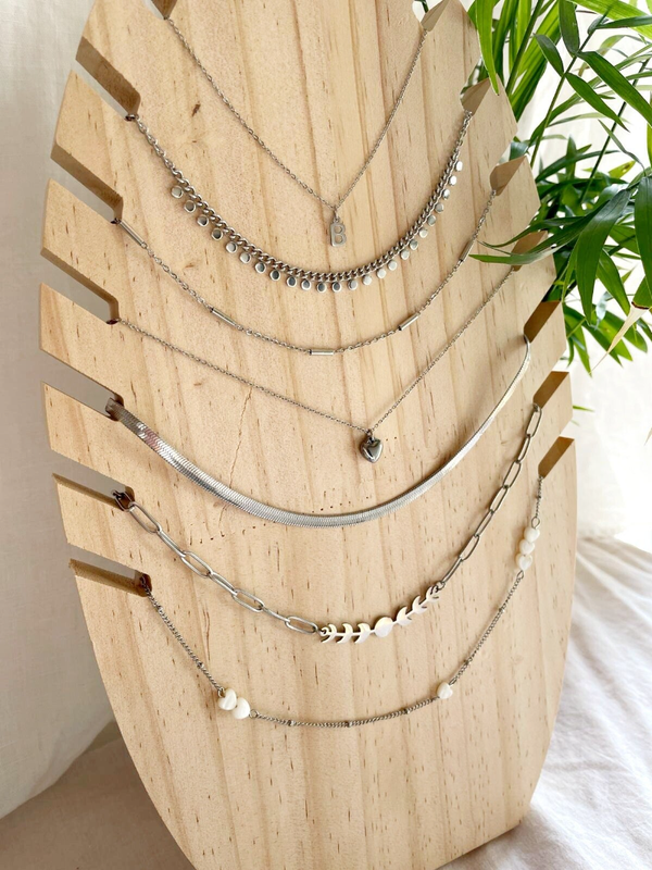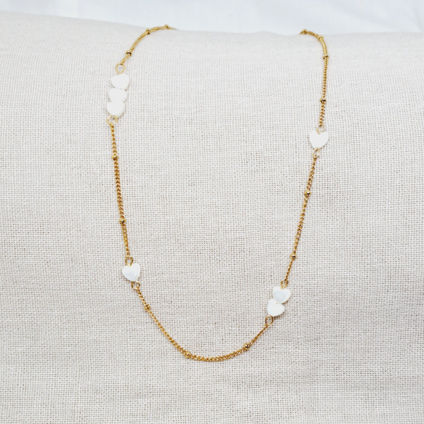 Stainless Steel ketting met bolletjes en schelp hartjes. De ketting is ongeveer 44 cm en verkrijgbaar in goud of zilver.