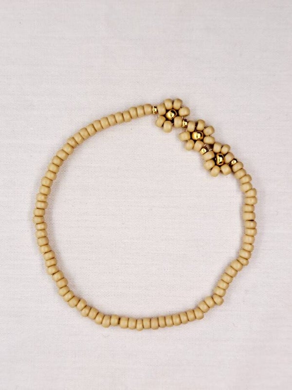 Elastisch armbandje van iets grotere, matte Miyuki kraaltjes gecombineerd met 3 bloemetjes.
