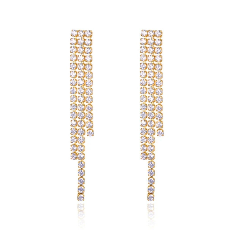 Stainless Steel oorstekers met sliertjes diamantjes. Verkrijgbaar in goud of zilver.