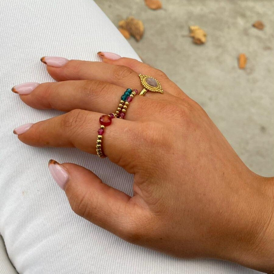 Deze elastische ringetjes zijn gemaakt van 3mm kraaltjes met een amber natuursteentje, gecombineerd met fuchsia facetkraaltjes.