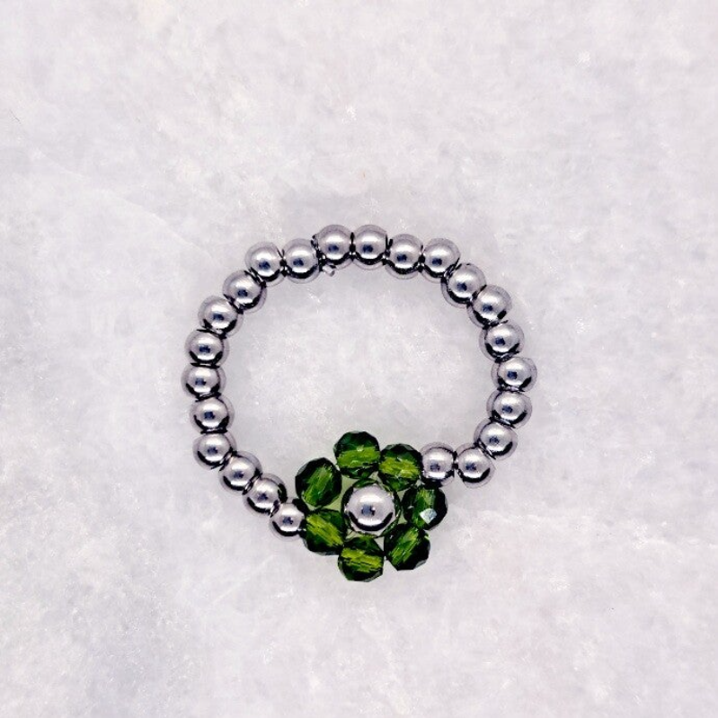 Elastisch ringetje van 3mm Stainless Steel kraaltjes met een bloemetje van facetkraaltjes.