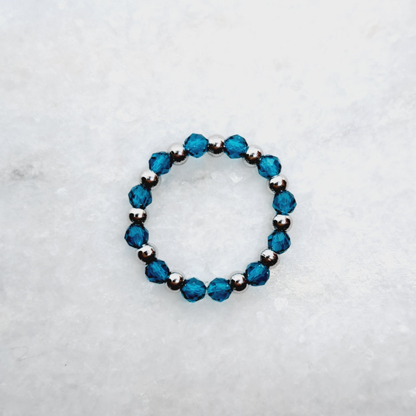 Deze elastische ringetjes zijn gemaakt van petrol facetkraaltjes met accenten in goud of zilver.