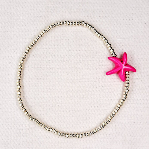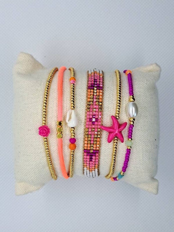 Elastisch armbandje van Miyuki kraaltjes gecombineerd met een felroze zeester. Verkrijgbaar in goud of zilver.