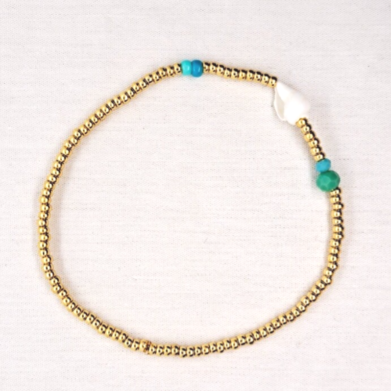 Elastisch armbandje, van vergulde Miyuki kraaltjes gecombineerd met een schelpje en verschillende kraaltjes.
