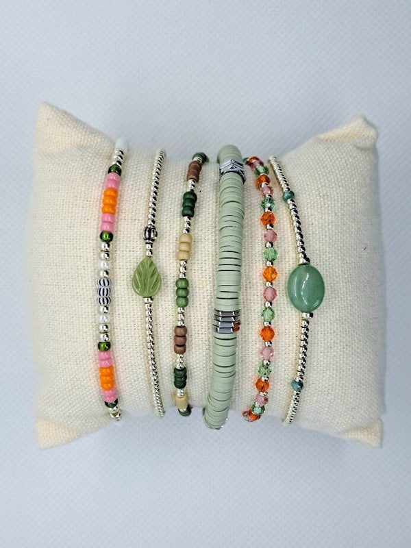 Elastisch armbandje van zeer mooie kwaliteit facet kraaltjes in oranje/roze/mint groene tinten en details van goud of zilver.