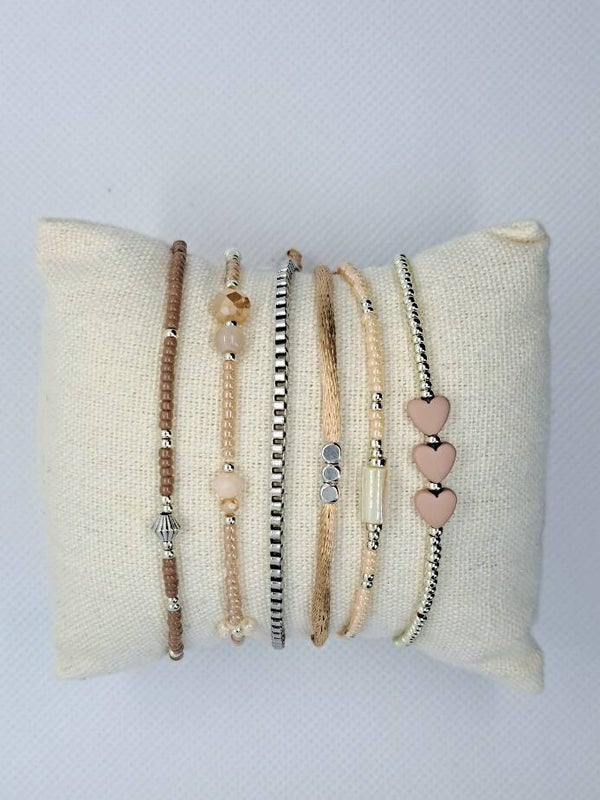 Fijn, elastisch armbandje van verschillende soorten kraaltjes. Verkrijgbaar in goud of zilver.