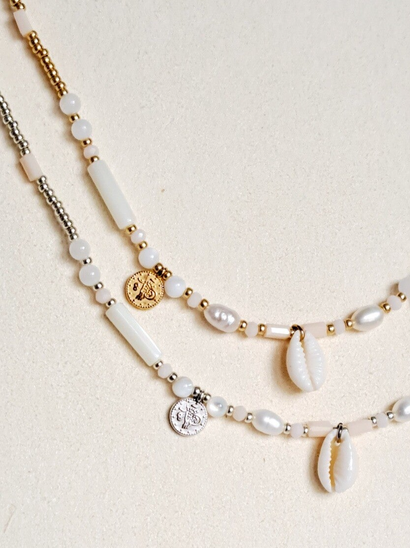 Choker ketting van verschillende soorten kraaltjes. Verkrijgbaar in goud of zilver.