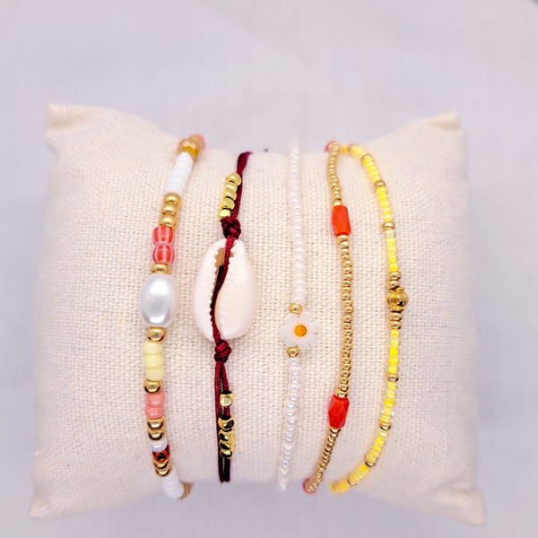 Elastisch armbandje van zachtgele Miyuki kraaltjes, een meloen kraaltje en details in goud of zilver.