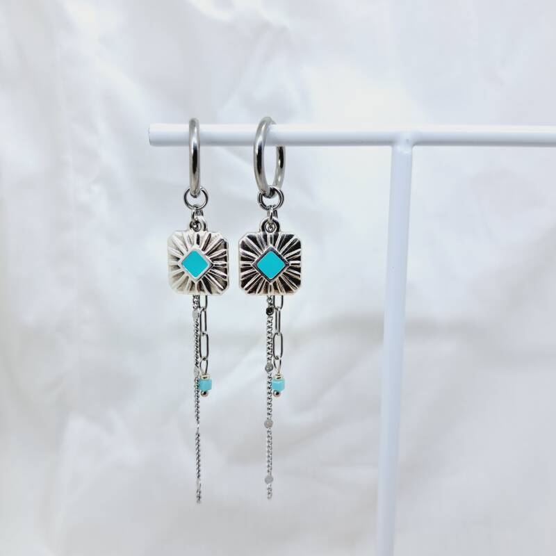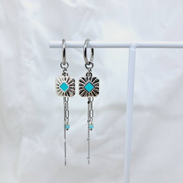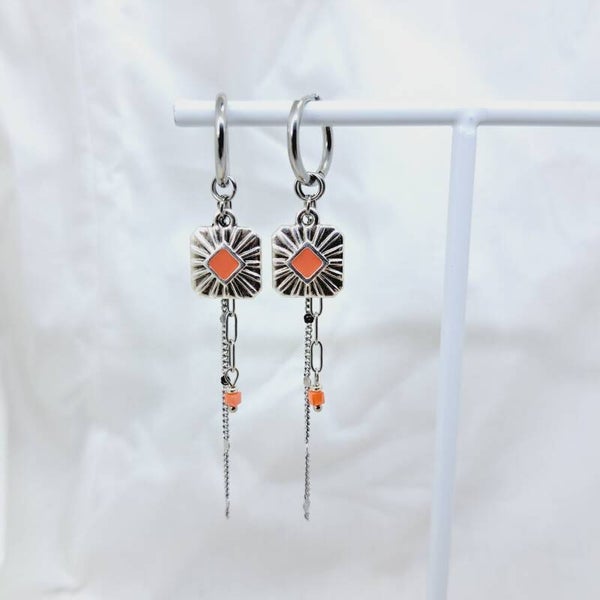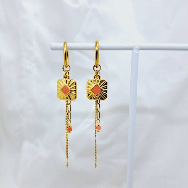 Stainless Steel oorringen van 16 x 2 mm met diverse bedeltjes met accenten van mint, koraal of lila. Verkrijgbaar per paar in goud of zilver.
