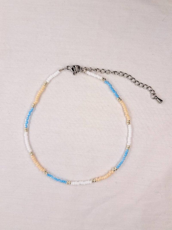 Enkelbandje van Miyuki kraaltjes in een frisse mix en accenten van goud of zilver.