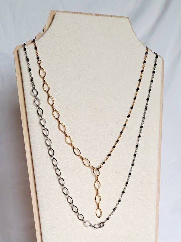Stainless Steel ketting met zwarte bolletjes, gecombineerd met een ovalen schakel. Verkrijgbaar in goud of zilver.