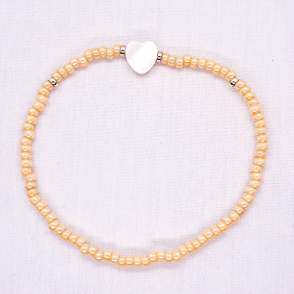 Elastisch armbandje van beige Miyuki kraaltjes met een hartje van schelp en details in goud of zilver.